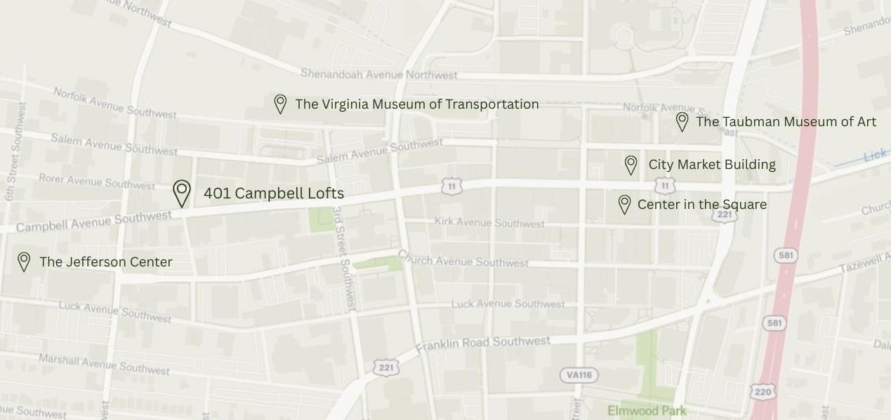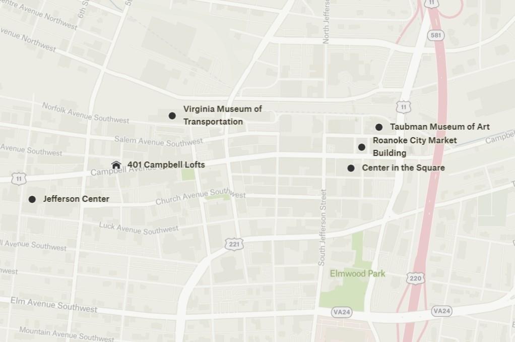 401 Campbell Lofts is only steps away from the finest Roanoke has to offer, including Elmwood Park, the City Farmer’s Market, Mill Mountain Theatre, Roanoke Children’s Theater, the world-class Jefferson Center, and more than thirty restaurants, shops, museums, and galleries. Your views might include such iconic landscapes as the nearby Taubman Museum of Art, The Hotel Roanoke or the Mill Mountain Star.