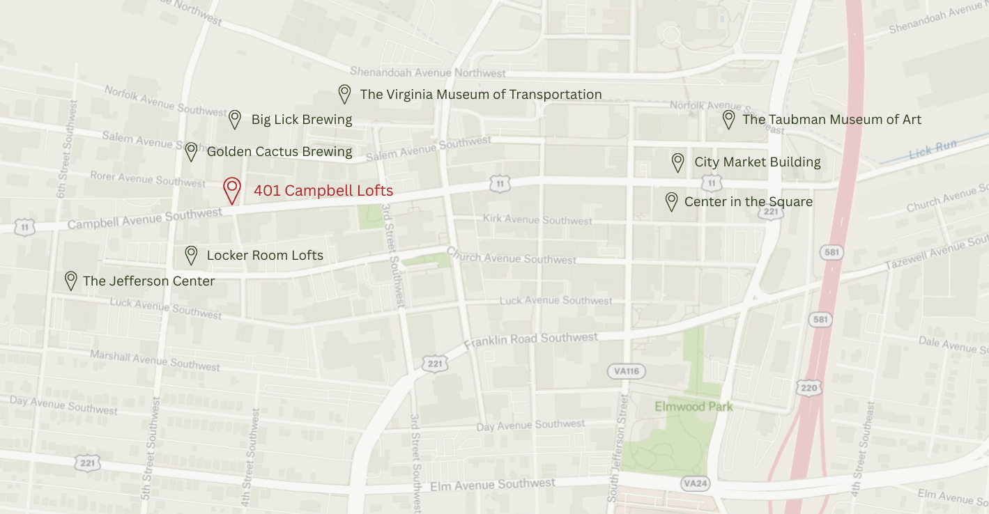 401 Campbell Lofts sits in the heart of Downtown Roanoke on historic Campbell Avenue, placing you steps from the city’s best dining, breweries, arts, and entertainment. From nearby parks and the City Market to local favorites and craft beer spots, the location offers a walkable, energetic lifestyle rooted in Roanoke’s industrial past and modern revival.